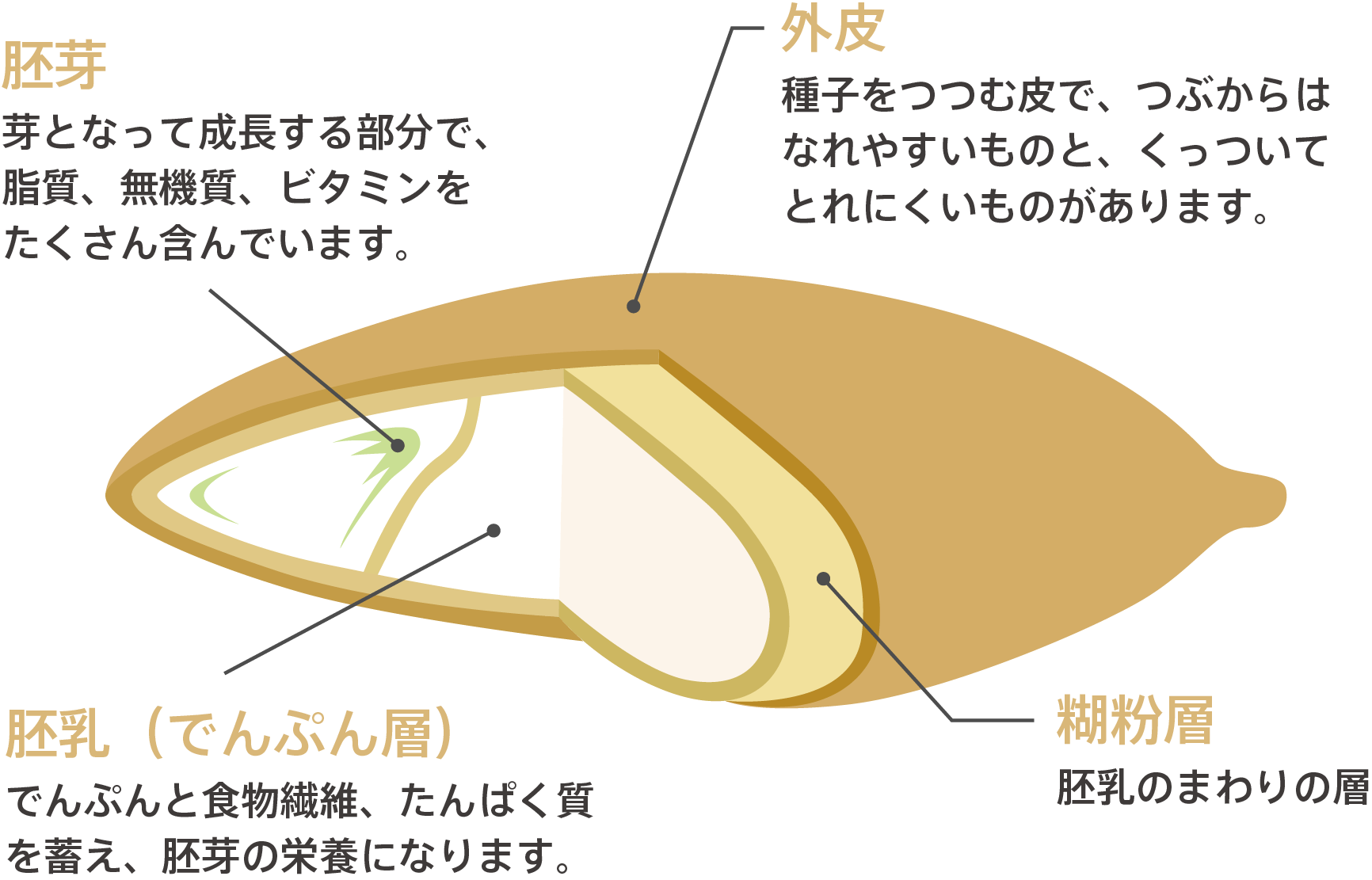 玄米、発芽玄米、全粒粉パン、黒米、赤米、そば、キビ、ヒエ、アワ、オートミール、そしてバーリーマックス®……これらはすべて全粒穀物です。全粒穀物とは精製していない穀物のこと。精製すると食べやすさや甘みは増しますが栄養素を含む胚芽や胚乳、外皮が取り除かれてしまうので、健康維持に欠かせないビタミンやミネラル、ポリフェノールなどの抗酸化物質、食物繊維量は減少してしまいます。そればかりか、でんぷん(糖質)ばかりになった穀物は血糖値の急激な上昇を引き起こします。