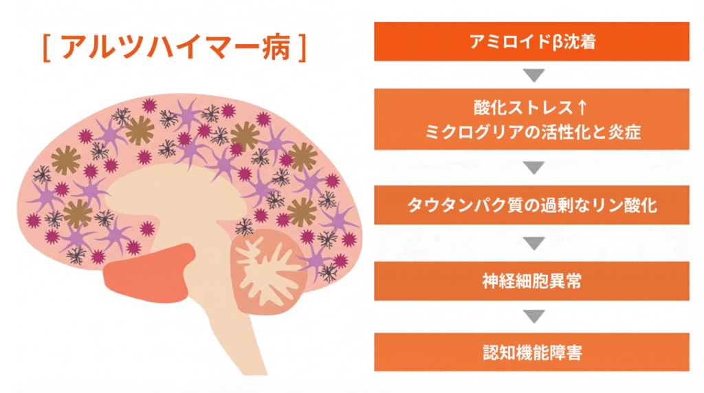注目すべきは、病理変化が症状の出現よりもはるかに早く始まっている点です。アミロイドβの蓄積は発症の約20年前から、タウの異常(神経原線維変化)は約10年前から進行していることが報告されています。つまり、「もの忘れが気になる」と自覚した時点では、脳内の変化はすでに長期間にわたって進んでいるということです34。